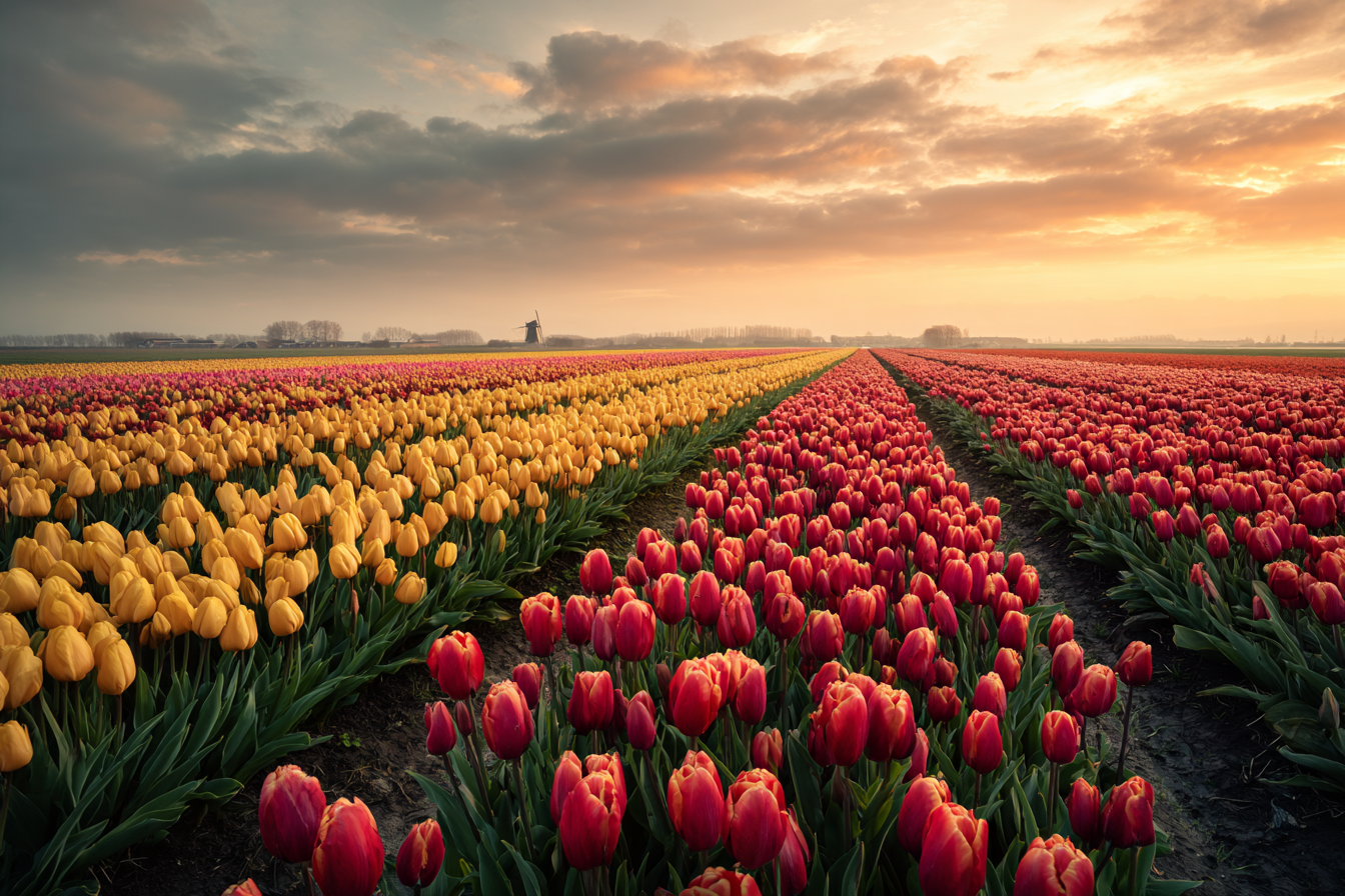 The Netherlands has been growing tulips for four centuries, and every April the country makes a case that it was worth the effort. The Bollenstreek — the bulb region stretching south from Haarlem along the North Sea coast — transforms into long horizontal stripes of red, yellow, pink, and purple that stretch to the horizon. Keukenhof opens its gates to seven million bulbs. The canals of Amsterdam reflect flowering cherry trees. The terraces fill.